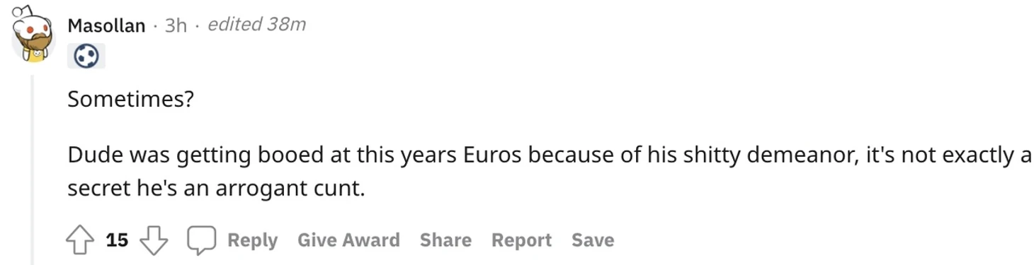 Иногда? Парня освистывали на прошедшем Евро из-за его ужасного отношения. Не секрет, что он высокомерный ###