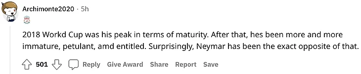 ЧМ 2018 был его пиком в плане зрелости. После этого он становился все более и более незрелым, капризным и самоуверенным. Удивительно, но Неймар — полная тому противоположность.