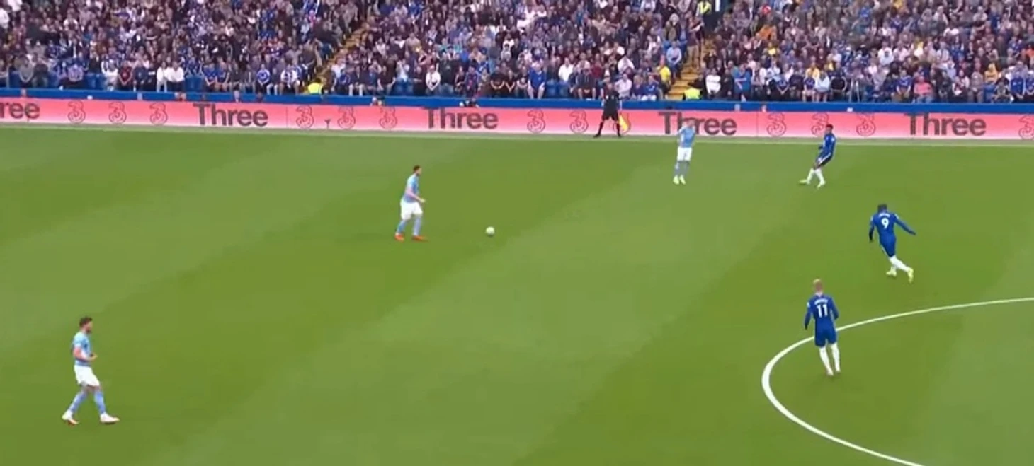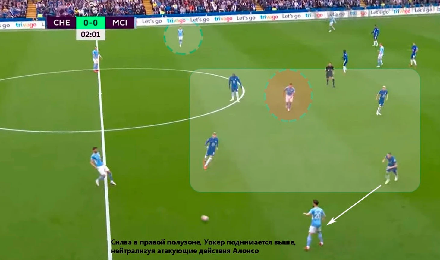 «Челси» пытался выманивать «Сити» короткими передачами и использовал несколько идей для этого. Первая с подниманием Алонсо высоко, что позволило бы Уокеру не подниматься высоко, что он пытался сделать на 2 — ой минуте матча: