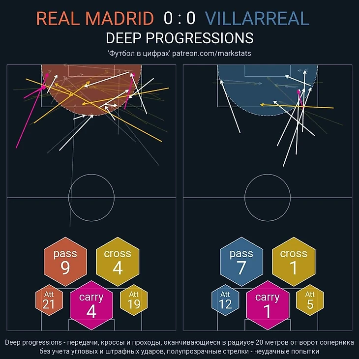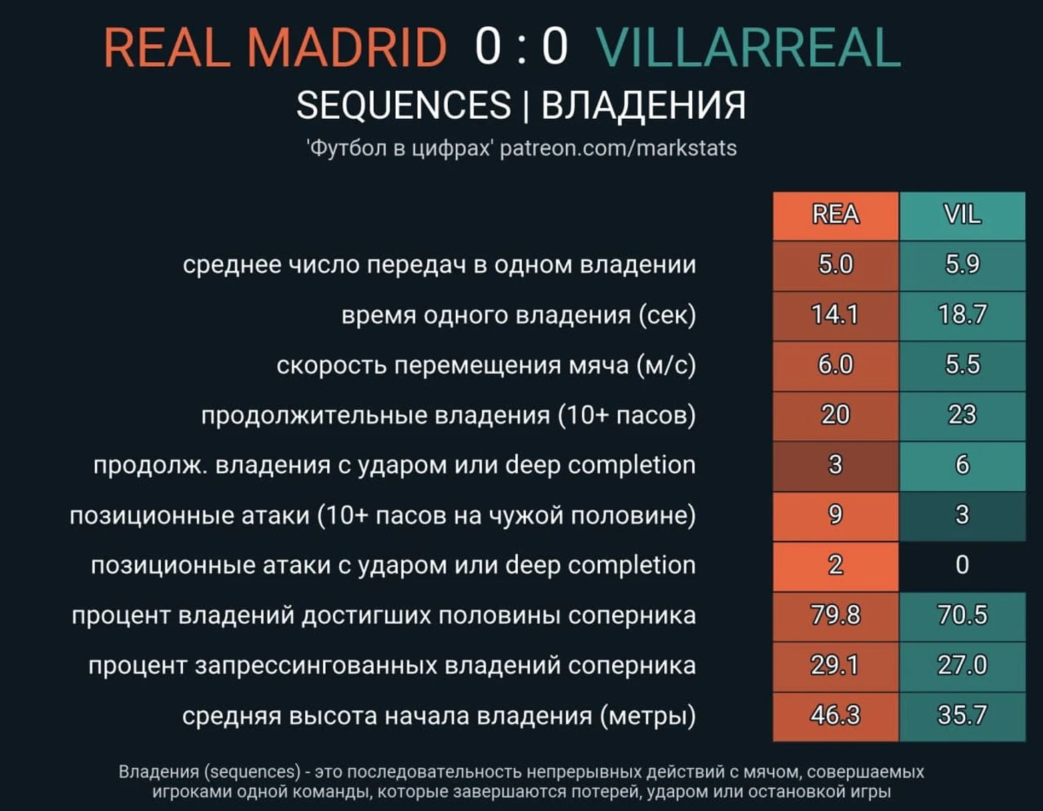 Несмотря на все комплименты "Вильярреалу" в плане стремления коротко разыгрывать и даже контролировать игру, нужно отметить, что во втором тайме в первую очередь им приходилось надеяться на свой средний/низкий блок: 40% на 60% по владению, 23% на 77% по наклону поля (берутся все действия команд в финальной трети, дальше смотрим, у кого какой процент от их общего числа). В этом плане стоит отметить шаг от Анчелотти: в перерыве поменял Родриго на Камавингу, на правый фланг ушёл Асенсио, и эта гибкость принесла дивиденды.