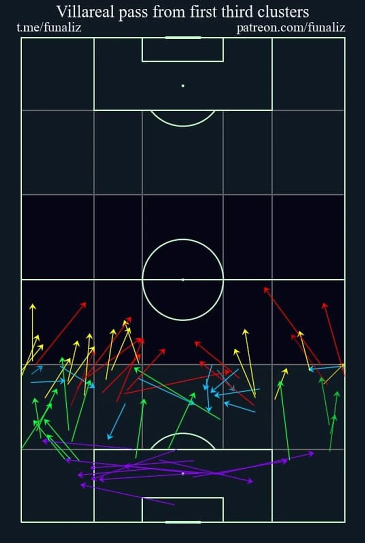 При кластерном анализе отчётливо просматривается стремление "Вильярреала" как можно меньше выносить мяч от своих ворот — средняя длина передачи из своей трети составила всего 23,9 метра (медианная — 19,7 метра). Прямолинейность по всем передачам составила 34,4% (почти на уровне «Реала», у которого было 31,5%), по передачам из своей трети — 30,6%. Для справки: прямолинейность — это отношение дистанции продвижения передачи (насколько от координаты её начала мяч продвинулся к координате центра ворот) к её фактической дистанции. Главная причина, почему "Вильярреал" мог без проблем проделывать подобные вещи, кроется в некоторых довольно устоявшихся принципах Карло Анчелотти: он уже довольно давно подстраивает систему под сильные качества лидеров и старается по максимуму размещать всех на поле. Такие вещи не могут не сказываться на системности команды в плане её позиционной дисциплины и игры в обороне — довольно редко проекты Карло получались очень мощными в плане прессинга; опять же, при таких вводных первоочередная задача — не утратить баланс полностью, то есть совсем не развалиться в обороне. С точки зрения качества такие идеи обычно реализовывались неплохо. Его гибрид схем 4-3-3 и 4-4-2 во времена первого захода в Мадрид был выстроен лучше, чем аналогичная по общему виду система в "Барселоне", например, во времена Вальверде. Однако это не делало его команды прессинг-машинами. Вероятно, отчасти от этого Эмери и отталкивался — тут не какие-то догадки, а тенденция, которую Анчелотти переносит за собой из клуба в клуб. В целом, план Унаи работал неплохо: в качестве индикатора лучше рассмотреть не 6 возвратов владения "Реала" в радиусе 40 метров от ворот Рульи, а скромные 29,1% успешно запрессингованных мадридской командой владений "Вильярреала".