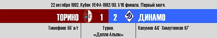 В последнем союзном первенстве динамовцы заняли лишь шестое место, но из-за перехода украинских команд в независимый чемпионат все же получили путевку в Кубок УЕФА. На первой стадии турнира подопечные Валерия Газзаева провели два разных матча с «Русенборгом»: первый – сверхуверенно (5:1), ответный – слишком вальяжно (0:2). Пройдя норвежскую команду, «бело-голубые» получили в соперники «Торино». В матчах с третьей командой Италии уже нельзя было позволить себе расслабиться.