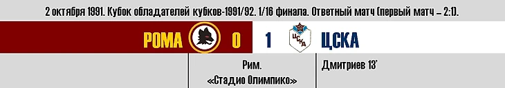 В Риме армейцам удалось быстро забить: полузащитники ЦСКА грамотным перепасом расчертили все поле, и Колесников с фланга доставил мяч точно на голову Дмитриеву. Защитники хозяев оказались в этом эпизоде лишь в роли наблюдателей. Футболистов «Ромы» по-прежнему устраивал результат по итогам двух матчей, и итальянцы не стремились форсировать события. Армейцы на этот раз помогать им не собирались.
