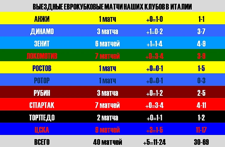 За всю еврокубковую историю наши клубы сыграли в Италии 40 матчей, из которых выиграли лишь восьмую часть поединков с местными клубами. Победы с Апеннинского полуострова привозили всего три команды – ЦСКА, «Динамо» и «Зенит». Если две последних добыли положительный результат лишь однажды, то армейцы добивались успеха целых три раза. Из наших клубов они играли с итальянцами чаще всего. Последняя на данный момент победа была одержана почти 9 лет назад: в декабре 2012-го зенитовцы под руководством итальянца Лучано Спаллетти переиграли «Милан».