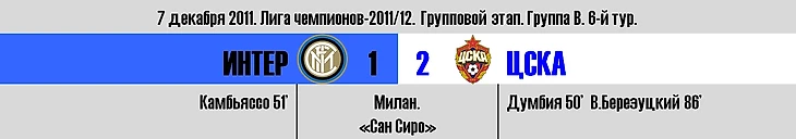 А в концовке матча состоялась своеобразная дуэль решающих моментов. Первым ударил «Интер»: Диего Милито откровенно простил армейцев, засадив мяч головой в перекладину после подачи Санетти. И уже в следующей атаке москвичи наказали «Интер» за расточительность. Защитники хозяев разобрали на угловом всех, кроме Василия Березуцкого, и тот беспрепятственно поразил ворота. Свою часть задачи армейцы выполнили.