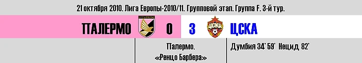 В дальнейшем давление армейцев нарастало, а роль завершителя взял на себя Думбия. И у него получилось куда успешнее. В первом тайме он замкнул фланговый навес Набабкина, а во втором отличился после издевательского дриблинга в штрафной соперника. В обоих случаях оборона хозяев предпочла не вмешиваться. Третий гол – коллективное творчество «армейцев». В два паса они преодолели середину поля, а третьим Секу вывел один на один Нецида. Чешский форвард, сменивший на острие Думбия, не подвел. К тому моменту лидер хозяев Пасторе уже покинул поле, получив две желтые карточки за споры с арбитром. «Палермо» не смог ничего противопоставить московской команде на своем поле.