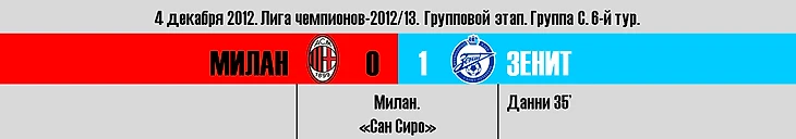 «Милан» к тому моменту уже обеспечил себе выход в плей-офф ЛЧ, так что состав хозяев был далек от основного. Тем не менее, перевеса в игре у «Зенита» не было. Хозяева регулярно создавали угрозы у чужих ворот, но их спокойно нивелировал Малафеев. Преимуществом зенитовцев стало то, что им действительно нужно было победить в этом матче. И в середине первого тайма они свой момент нашли: Семак неудачно обработал мяч в штрафной, но защитники хозяев не смогли быстро сориентироваться, и первым на отскоке оказался Данни. Португалец в касание послал мяч в сетку.