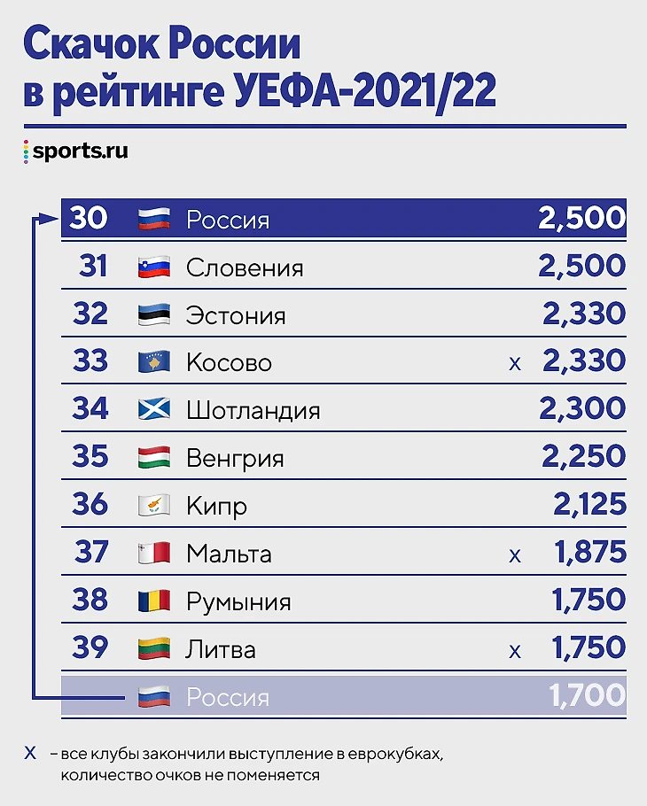 Апдейт по рейтингу УЕФА-2021/22: Россия прорвалась на 30-е место. Обогнали Мальту, Кипр и даже Эстонию
