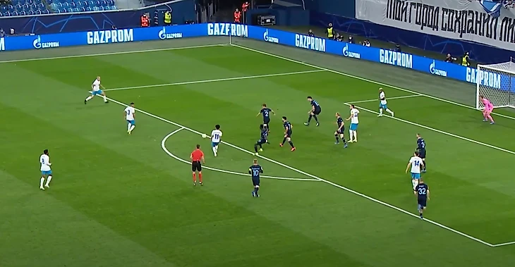 При этом Зенит очень много бил из-за штрафной, но попасть удалось тому, от кого этого ожидали меньше всего – Сутормину. Например, в моменте на фото Сантос имел 3 секунды, чтобы прицелится и пробить – мимо. Команды нижней восьмерки РПЛ быстрее реагируют на опасность у своих ворот.