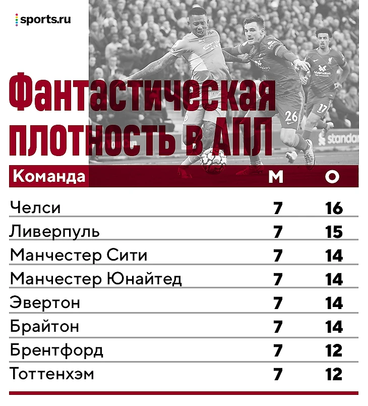 А дальше идет группа из четырех команд с 14 очками: «Манчестер Сити», «МЮ», «Эвертон» и «Брайтон».