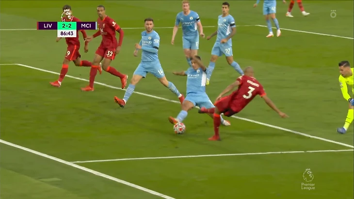 Счет сравнялся на 81-й минуте, а дальше – напряжение. «Сити» круто летел в быстрые атаки и создавал моменты, но самый явный шанс забить был у «Ливерпуля». После подачи штрафного Эдерсон не добрался до мяча, а Фабиньо оказался с мячом на углу вратарской и перед пустыми воротами.
