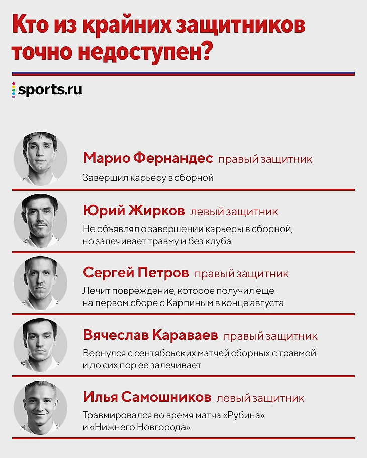 Из защитников, способных сыграть на краях, остались Федор Кудряшов (не играл на позиции левого дефа с прошлого сезона), Сергей Терехов (в «Сочи» играет на левом краю по схеме в пять защитников) и 21-летний левый защитник «Урала» Арсен Адамов, которого вызвали вместо Самошникова.