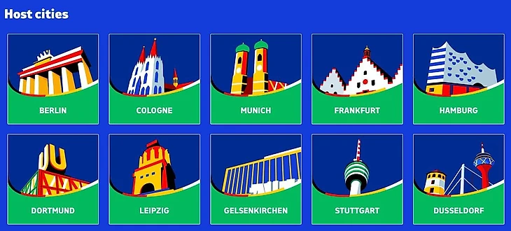 Тем не менее, национальный колорит здесь выражен, но не так открыто. Впервые с 2012 поменялось начертание в текстовой части – теперь это геометрический гротеск, типичный для немецкой шрифтовой школы (сравните с австрийско-швейцарским Евро-2008, где использовали что-то схожее на Futura – классику этого жанра). Более того, в букве О и в самом знаке угадываются черты легендарного берлинского Олимпиаштадиона – иконы не только немецкого спорта, но и архитектуры.