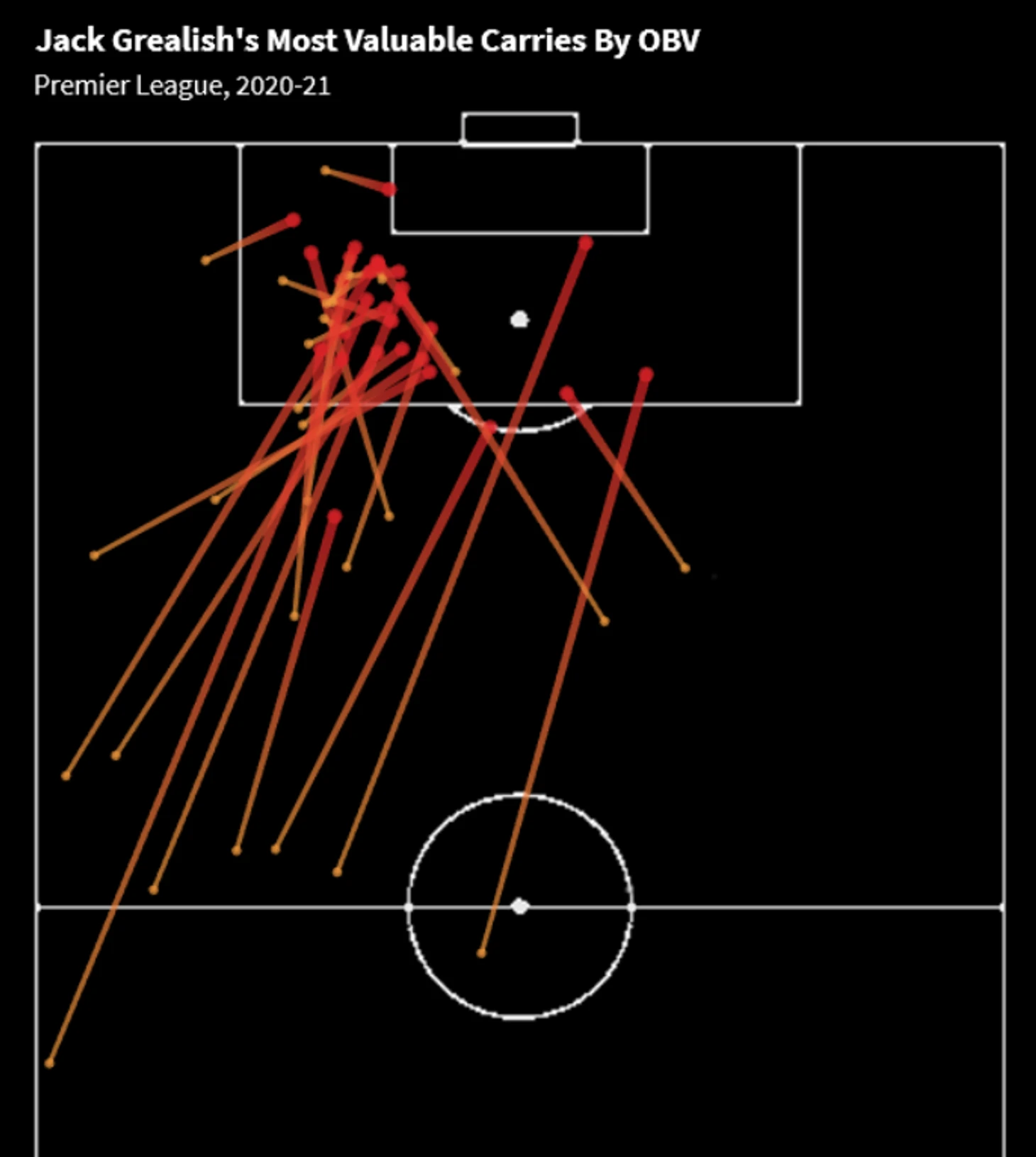Рассмотрим отдельно лидера рейтинга - Джека Грилиша. Его 30 продвижений мяча с наибольшими OBV больше похожи на карту пасов. В прошлом сезоне почти все самые эффективные carries Джек совершал на территории соперника, покрывая при этом огромное расстояние.