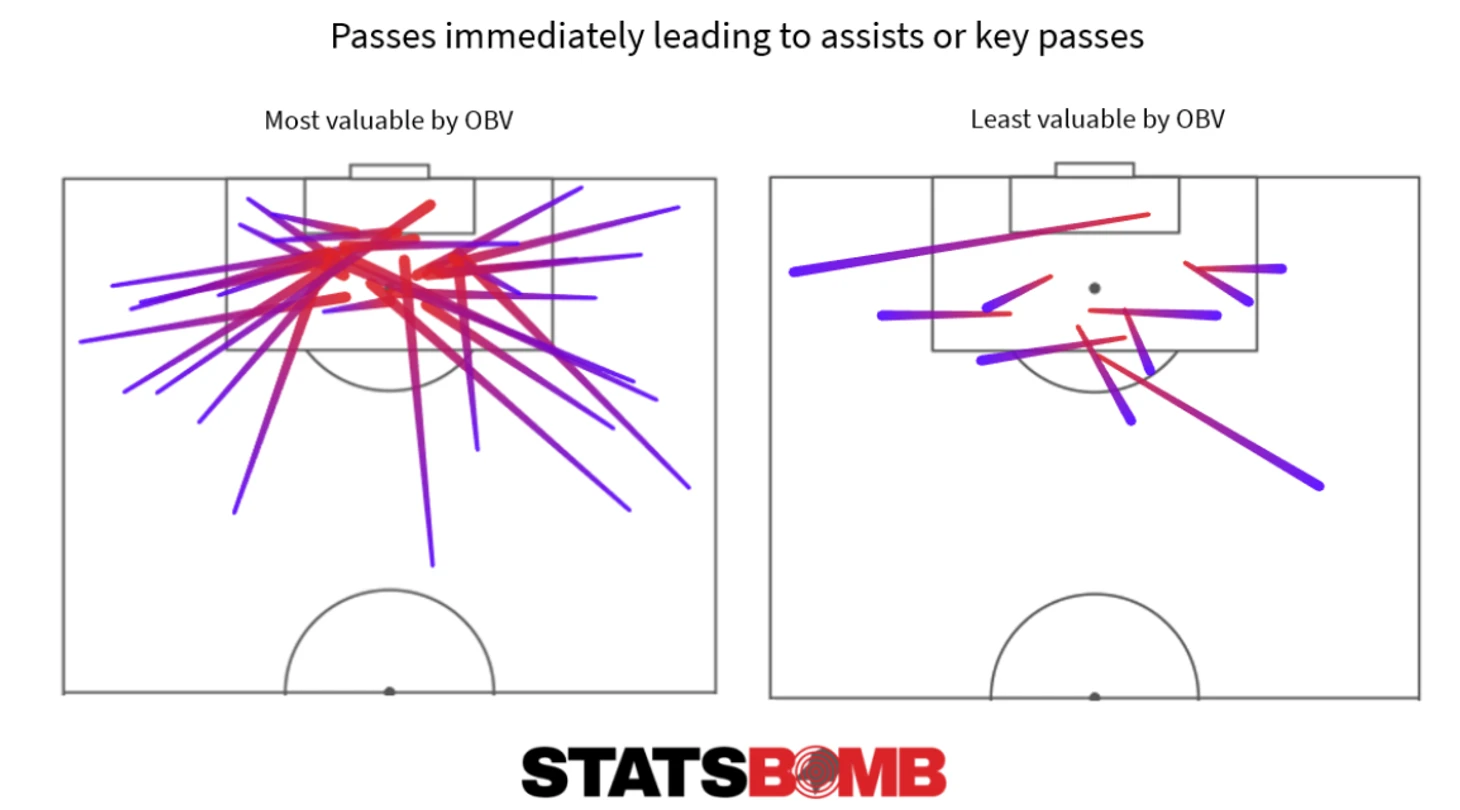 OBV относится к Possession Value (PV)-метрикам - статистикам, анализирующим каждое владение мячом. Подобные метрики не столь новы (самым популярным моделям, например, EPV, уже больше двух лет), но в отличие от общеизвестных xG / xT моделей строятся на основе более продвинутых моделей машинного обучения (например, нейросетей) и уже сейчас все больше используются как в первую очередь клубами, так и провайдерами данных / медиа. Больше технических деталей можете найти в предыдущем посте, а этот пост - об их интерпретации.