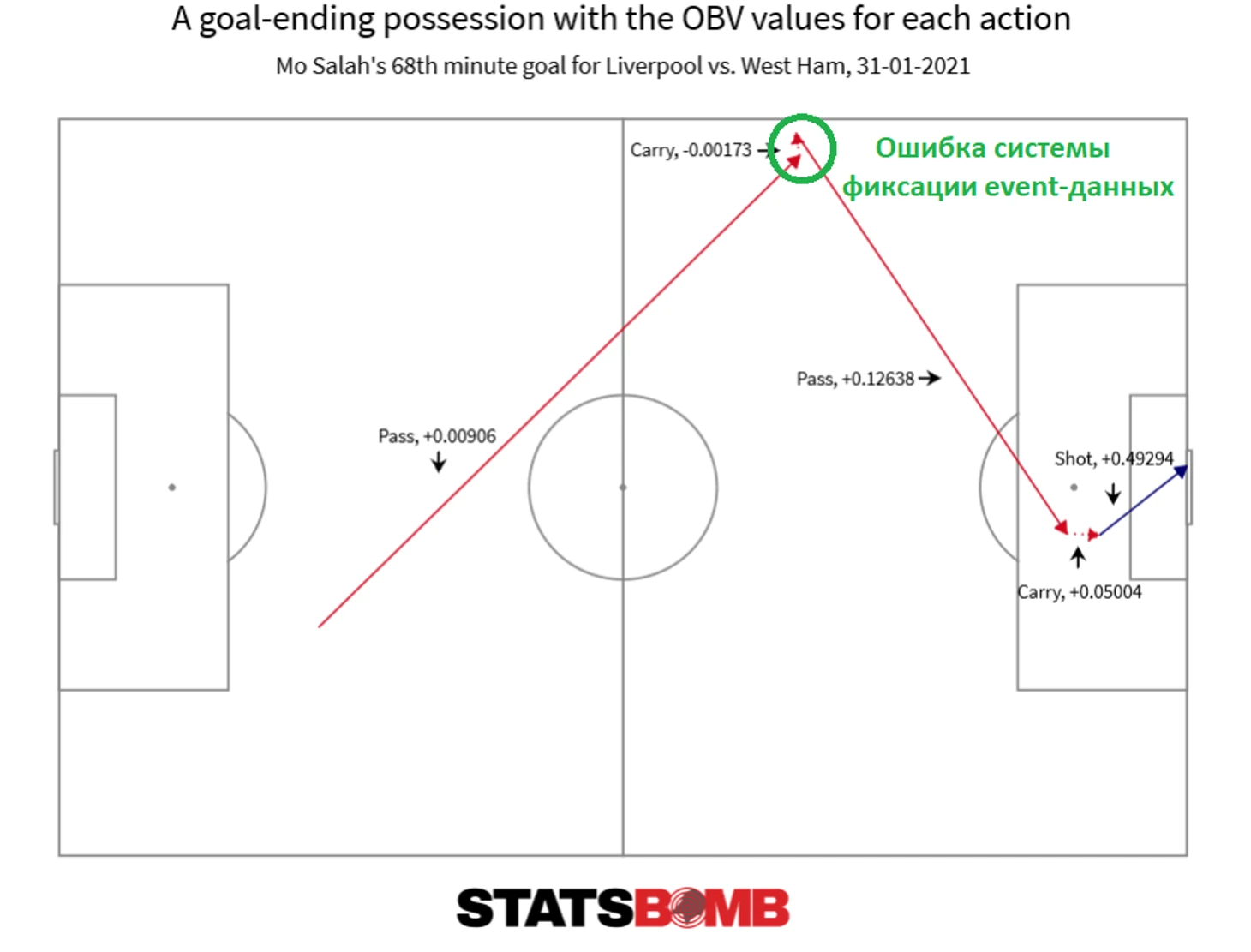 (Для уточнения информации относительно указанной ошибки я написал сотрудникам StatsBomb в twitter. Мне ответили довольно оперативно, описав вероятный механизм возникновения ошибки и особенности расчета показателя carry, которые были приведены выше. Также стоит напомнить, что для расчета метрики OBV используются данные StatsBomb 360 - относительно новый продукт. Мне уже приходилось слышать от людей, кто успел поработать с 360 данными, что они содержат некоторые неточности. Вероятно, с течением времени точность фиксации будет постепенно повышаться, и, как следствие, будут получаться более точные значения метрики OBV)