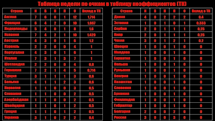 Вот так выглядит таблица стран по итогам третьей недели еврокубков (учитываются только те страны, чьи клубы участвуют в групповых этапах):