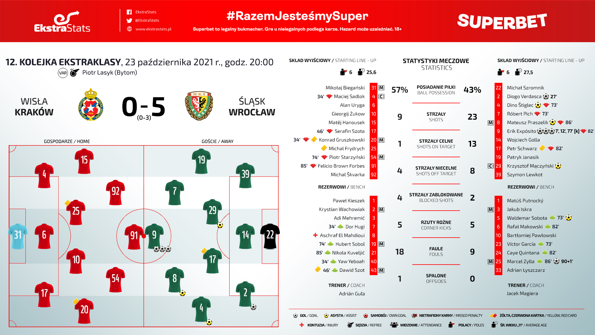Во втором тайме «Шлёнск» чуть сбавил темп игры, попытки «Вислы» же забить хотя бы гол престижа не выглядели опасными. Не помогли и две замены, которые Адриан Гула сделал ещё до перерыва. Оборона краковчан продолжала ошибаться, на 75-ой минуте Урыга сфолил в собственной штрафной на Экспозито, а испанец оформил хет-трик, пробив с одиннадцатиметровой отметки.