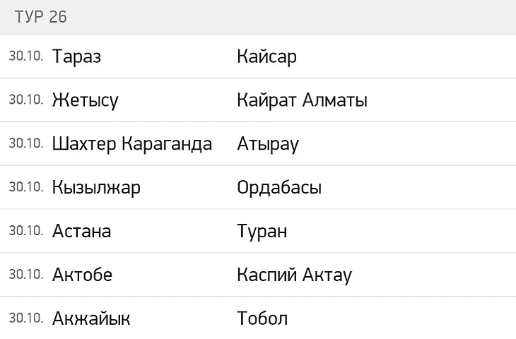 "Актобе" - "Каспий". Как и предыдущие матчи, этот ничего не решает, но есть в нём долька принципиальности, в какой то степени это западно-казахстанское дерби. Также болельщики "Актобе" заслужили достойного закрытия сезона в домашнем матче. Победа "Актобе".