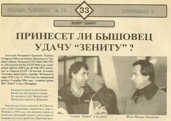 В конце 1996 года руководство «Зенита» отправило в отставку Павла Садырина, который вытащил команду из пучины первой лиги и показал достойный результат в сезоне-1996, и назначило на пост главного тренера Анатолия Бышовца. Против этого решения протестовали болельщики и даже игроки, но Виталий Мутко был непреклонен. По весне все устаканилось: «Зенит» неплохо стартовал в чемпионате и вышел в полуфинал кубка, одержав в четвертьфинале гостевую победу над «Спартаком».