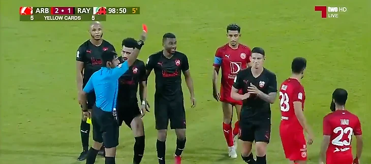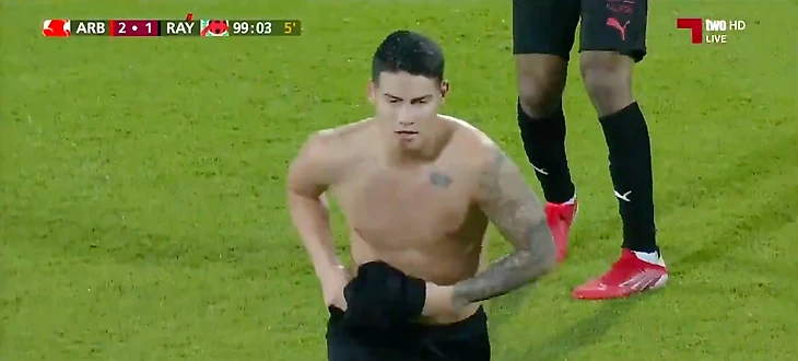 Все началось с крайне спорной желтой карточки, показанной колумбийцу. Хамес был с мячом, а игрок «Аль-Араби» сам налетел на Родригеса. В итоге упали оба, но есть ощущение, что фолил как раз футболист «Аль-Араби».