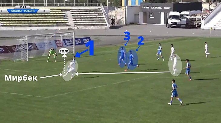 Свой пятый гол Мирбек Ахматалиев забил в ворота "Илбирса". Здесь он получил мяч от своего партнера, который до этого в одиночку протащил мяч до штрафной "Илбирса" и аккуратно ассистировал Мирбеку. По Мирбеку работал защитник "Илбирса" (1), но он не смог заблокировать удар. А защитники "Илбирса" (2, 3) не смогли прервать передачу на Мирбека и оказались абсолютно бесполезными в этом эпизоде. Очередной классный гол Мирбека с левой ноги.