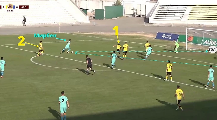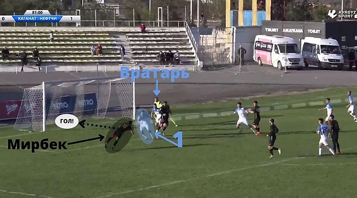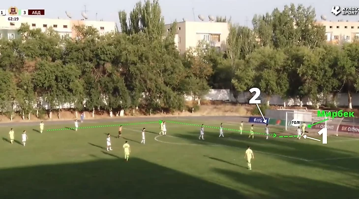 Третий гол Мирбек Ахматалиев забил в ворота "Нефтчи". Здесь пришла передача с правого фланга и Мирбек в гордом одиночестве головой забил в пустые ворота. Защитник "Нефтчи" (1) допустил грубую ошибку. Ему нужно было контролировать Мирбека. А также вратарь "Нефтчи" почему-то вышел слишком далеко оставив свои ворота пустыми. В момент удара он попытался перестроиться, но было уже слишком поздно.