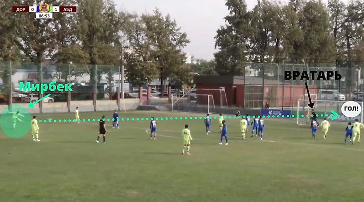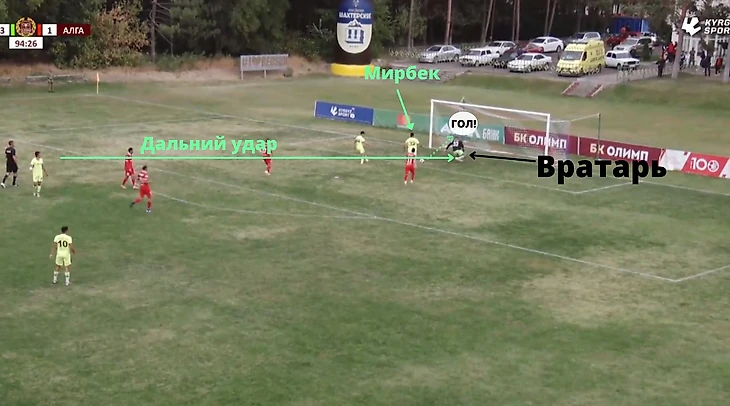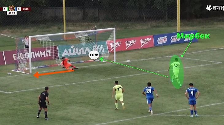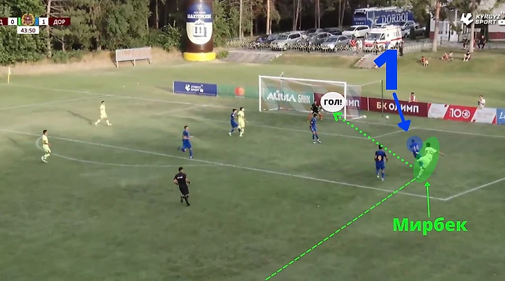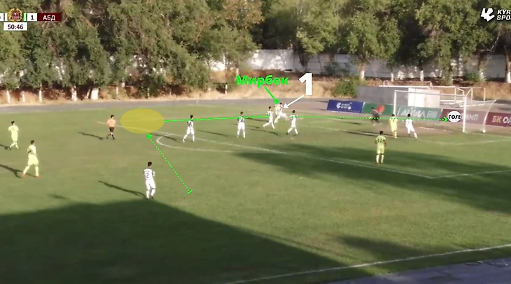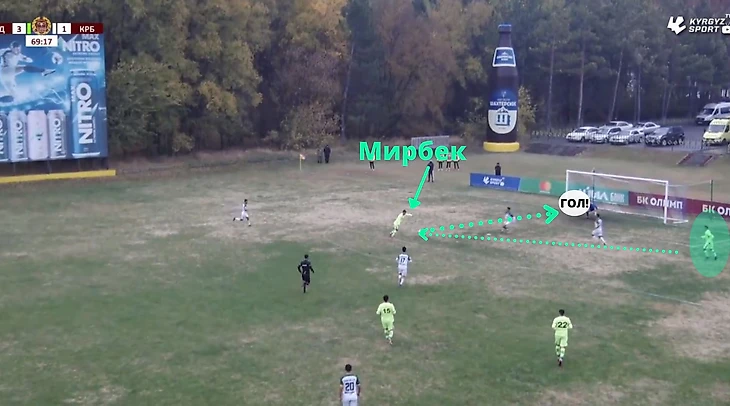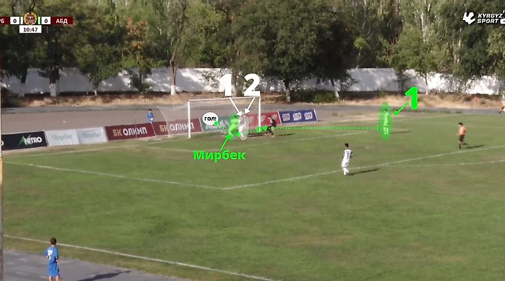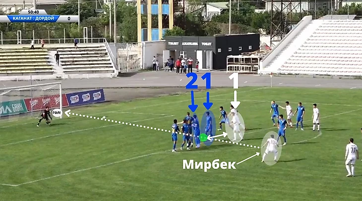 Свой шестой и последний гол за "Каганат" Мирбек Ахматалиев забил в ворота "Дордоя". Этот гол был забит со штрафного удара. "Дордой" выстроил стенку из пяти игроков. А игрок "Каганата" (1) стоял между игроками "Дордоя" (1, 2) и в момент удара резко отошел в сторону. Мирбек точно попал в зеленую точку, где до удара стоял игрок "Каганата" (1). Очень хорошо в этом эпизоде игроки "Каганата" исполнили штрафной удар, а Мирбек забил свой очередной прекрасный гол.