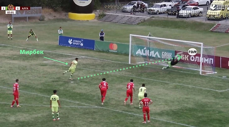 Свой тринадцатый гол Мирбек Ахматалиев забил со штрафного удара в ворота "Алги". Здесь вратарь "Алги" построил внушительную стенку из семи футболистов, чтобы обезопасить левый от себя угол ворот. А для того, чтобы обезопасить правый от себя угол, он поставил двух игроков. В момент разбега игрок "Алги" (1) начал приближаться к Мирбеку, судья попросил его вернутся назад и когда он только начал возвращаться - был нанесен чудовищной силы удар, который застал врасплох вратаря "Алги" и игрока (1). Никто не смог среагировать на такой сильный удар.