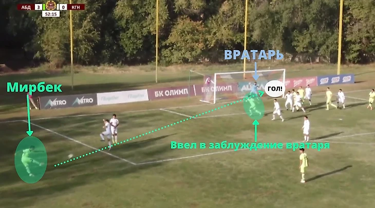 Свой шестнадцатый гол Мирбек Ахматалиев забил в ворота бывшего клуба - "Каганата". Здесь все думали, что будет подача в штрафную. Однако в этом эпизоде ключевую роль сыграл игрок "Абдыш-Аты", который ввел в заблуждение голкипера "Каганата" и пропустил мяч, который в итоге никого не задев отправился точно в дальний угол ворот.