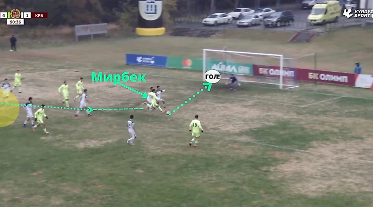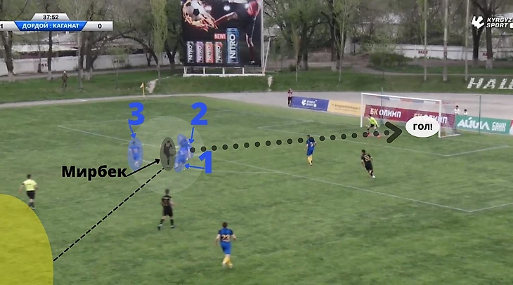 Четвертый гол Мирбек Ахматалиев забил в ворота "Дордоя". Этот гол был очень похож на второй гол Мирбека. В районе желтого круга отобрал мяч у игрока "Дордоя", разбежался, его первым встретил защитник "Дордоя" (1), Мирбек сделал ложный финт, обыграл его и не сближаясь с защитником "Дордоя" (2) точно пробил в левый нижний от вратаря угол. А игрок "Дордоя" (3) в этом эпизоде просто оказался бесполезен. Здесь Мирбек впервые использовал свою левую ногу для взятия ворот.