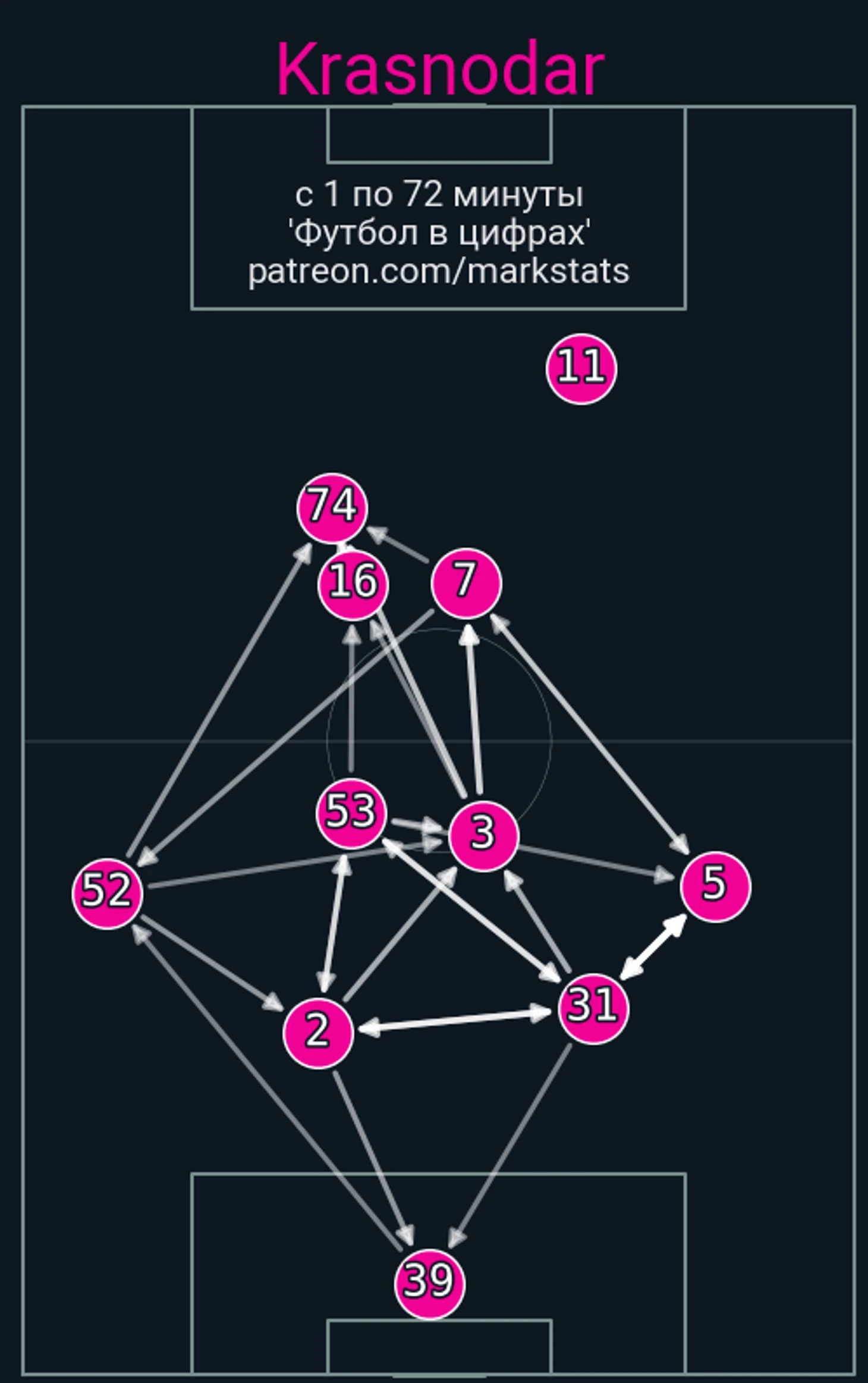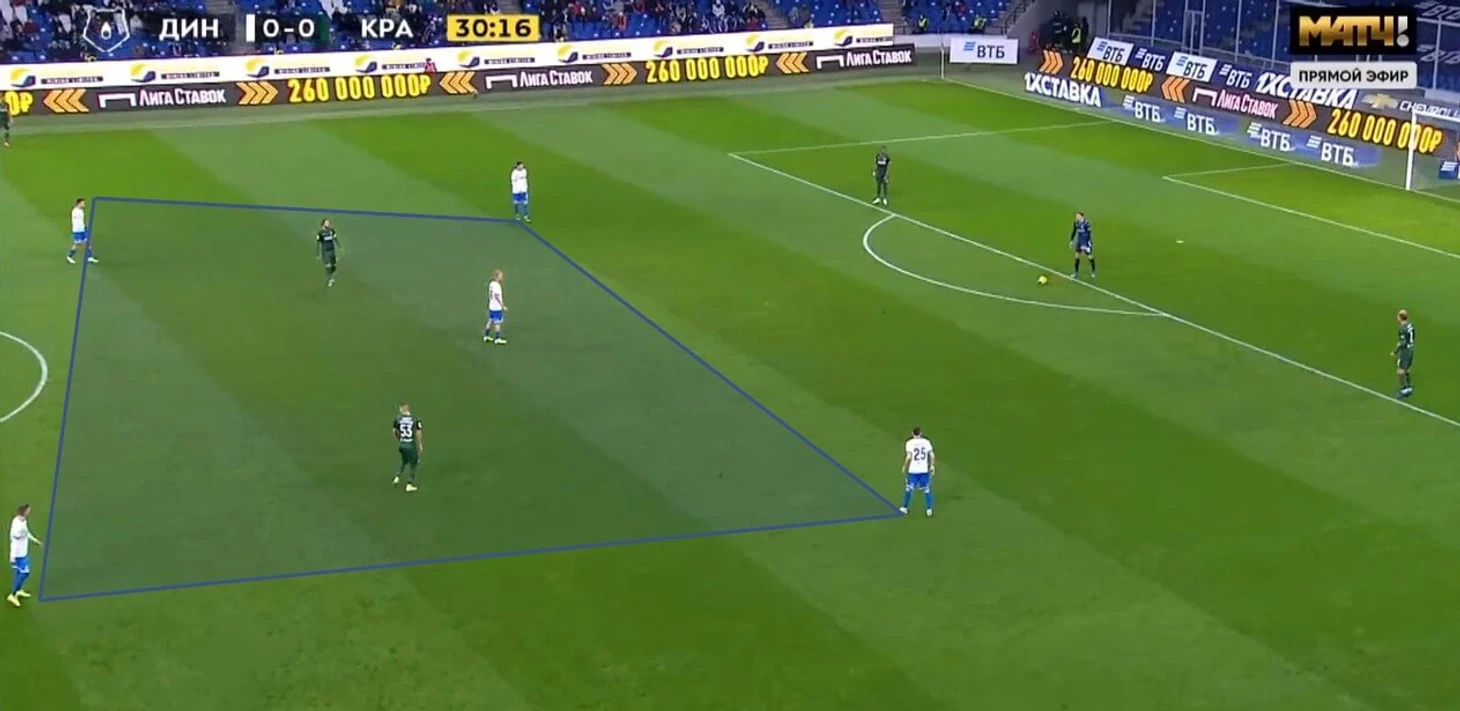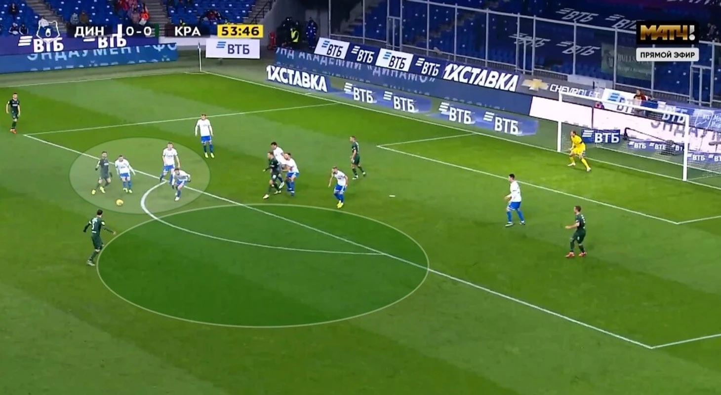«Краснодар» часто задействовал Сафонова как третьего центрального защитника при розыгрыше от своих ворот (у Матвея 11 передач с продвижением, лучший на поле наряду с Сорокиным), а динамовцы ставили своей целью минимизировать возможность выхода из обороны через пару опорных. За счет смещений Тюкавина вглубь построение хозяев в давлении на чужой трети часто напоминало ромб: