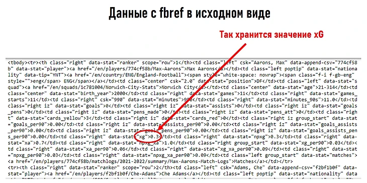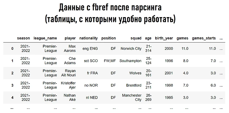 Та табличка с колонками, которую вы видите в браузере на сайте fbref, хранится в виде html-кода. С помощью python-а вы можете этот код скачать и далее достать из него полезную для вас информацию (в нашем случае данные о игроках и командах). Такая процедура называется - парсинг данных.