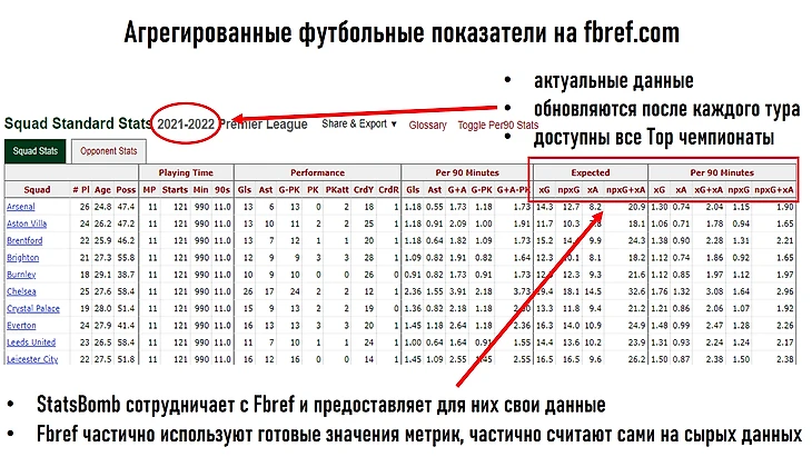 У нас есть альтернатива - интернет ресурсы, на которых представлен широкий спектр уже рассчитанных игровых показателей на основе данных о событиях. Самый популярный из известных мне сайтов - fbref.