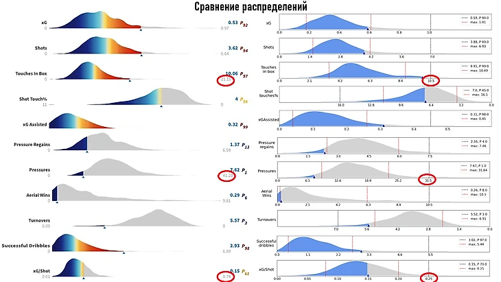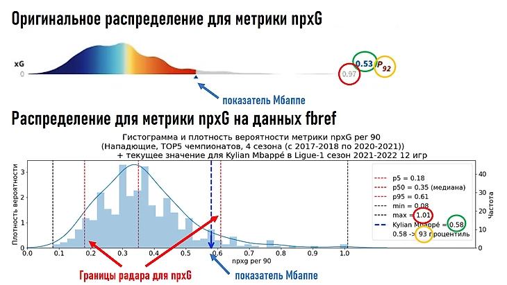 Для построения радара нужно создать шаблон, на котором будут отмечены соответствующие граничные и промежуточные значения. Эти значения можно получить из истории по предыдущим сезонам, построив распределения значений для каждой конкретной метрики (справа на радаре StatsBomb).