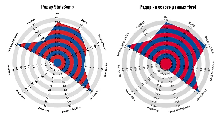 Самый главный нюанс, который мне удалось обнаружить, заключается в том, что fbref и StatsBomb по разному считают игровое время. Если вы возьмете свежий радар от StatsBomb и сразу посмотрите таблицу на fbref то увидите некоторое отличие в количестве сыгранных 90s (90-минутных интервалов). StatsBomb считает чистое время (с учетом добавленных значений), fbref не учитывает добавленное время. Обычно, для игроков, которые имеют много игрового время такое отличие составляет плюс (1 ÷ 1.5) 90s по ходу сезона - одна игра или даже больше.