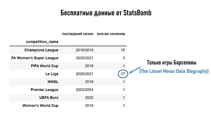 Первая проблема заключается в том, что данные предоставляются в основном не самые свежие и в довольно сжатом объеме. Ниже пример турниров и самых актуальных сезонов, по которым можно получить бесплатные event-данные от StatsBomb. Самая большая история доступна по играм Барселоны. Внутри StatsBomb этот датасет позиционируют как максимально полный источник данных по Лионелю Месси и называют - The Lionel Messi Data Biography.