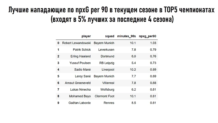 Ниже для примера рассмотрим рейтинг нападающих их Тоp5 чемпионатов, которые по npxG входят в 5% лучших нападающих последних 4 лет. Мы должны отфильтровать данные fbref по текущему сезону, оставив только нападающих, которые имеют npxg_per90 больше или равную 0.61. Также я поставил ограничение на минимум 5 сыгранных матчей.