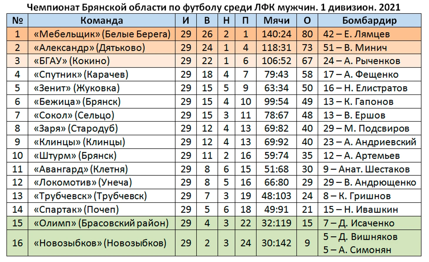 Абсолютный же рекорд результативности принадлежит Евгению Лямцеву, в 2016 году отличившемуся в чемпионате 55 раз. Им же установлен рекорд по количеству выигранных снайперских гонок (5 раз). В 2021 году Евгений стал самым результативным футболистом в истории чемпионатов Брянской области (344 забитых мяча в 1 дивизионе).