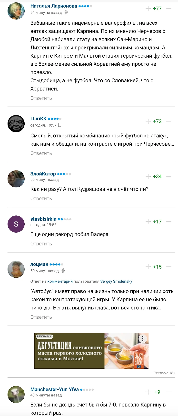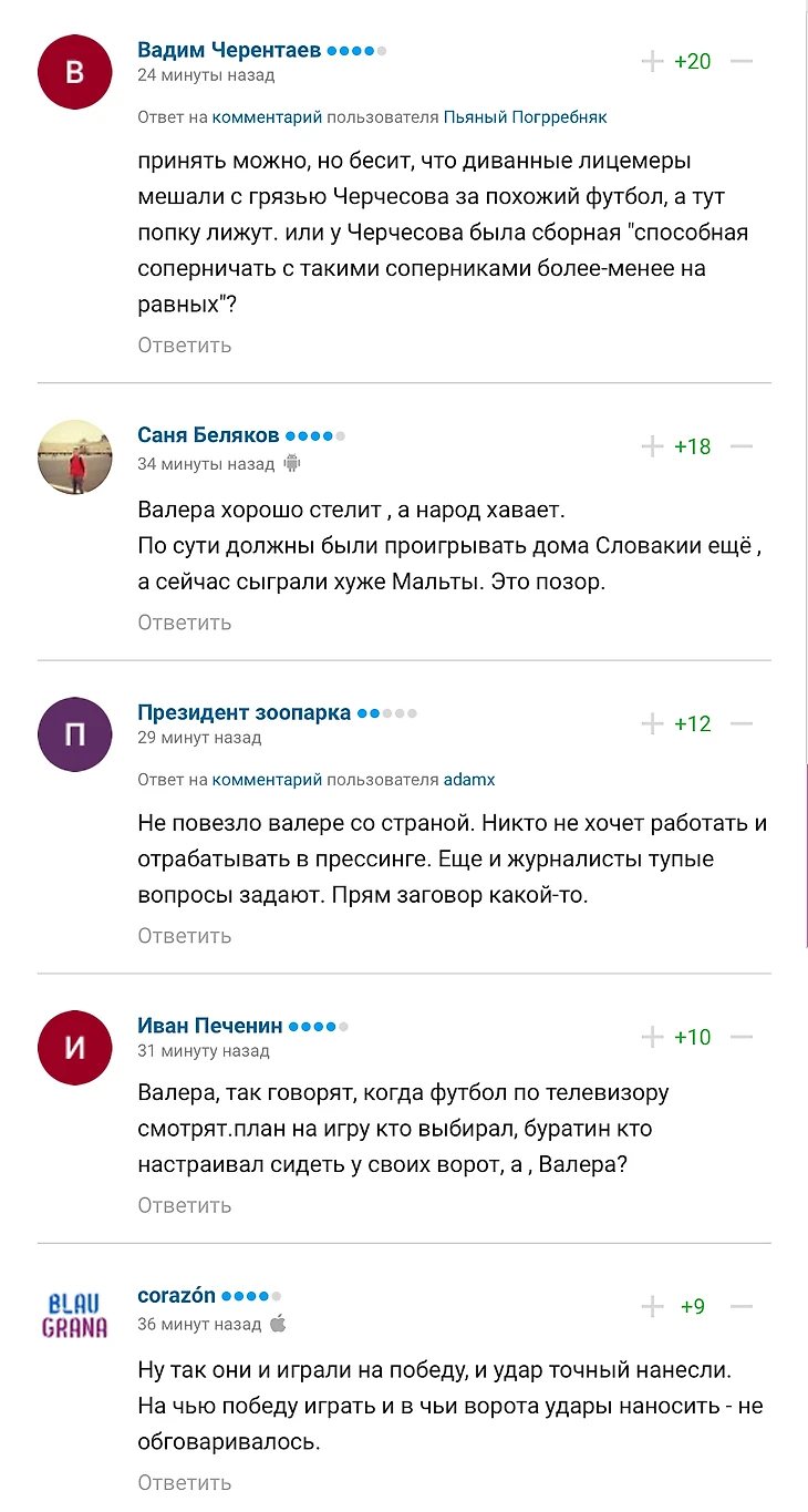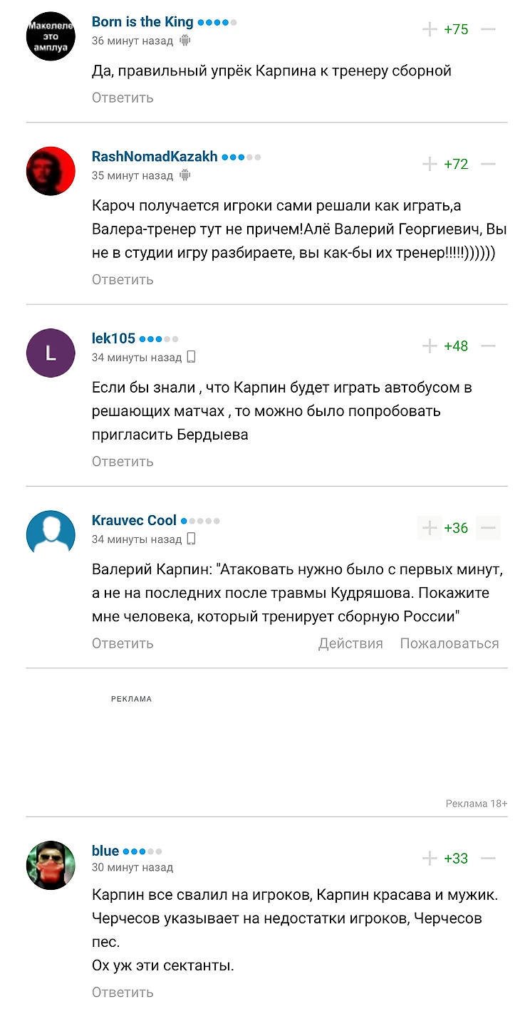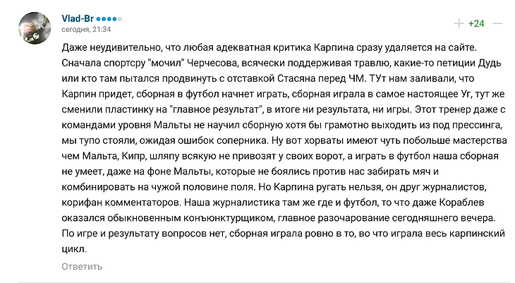 Что ж, мне здесь просто нечего сказать. Просто возникает вопрос: а кто тренер сборной? Лучше я приведу комментарии пользователей под новостью об интервью Карпина: