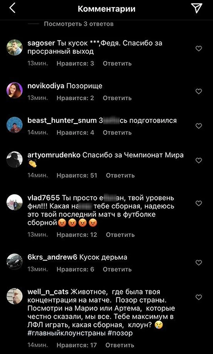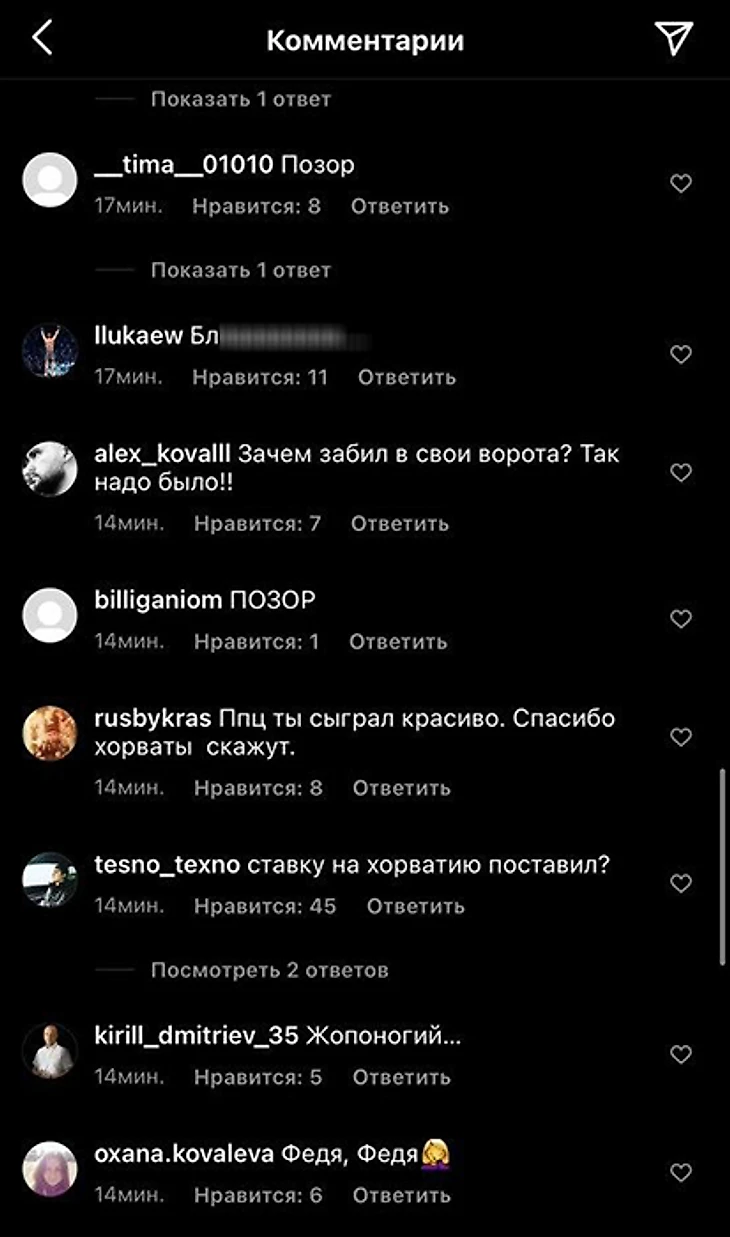 В Сплите сборная России два раза ударила по воротам и каждый второй пас отдавала сопернику, но многие фанаты посчитали, что в поражении виноват один Федор Кудряшов, забивший в свои ворота. После матча с хорватами защитнику прилетело в соцсетях – оскорблений было так много, что Кудряшов закрыл комментарии.