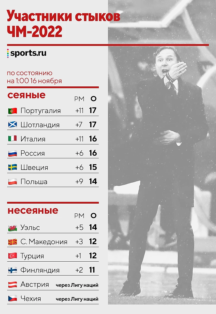 • Но посев вряд ли даст броню. Даже если на первом этапе получим соперника послабее, на втором можем нарваться на кого-то серьезнее. Например, на Португалию (на последних минутах проиграла дома Сербии и пропустила ее напрямую), Италию (пропустила в лидеры Швейцарию, сыграв нули с Северной Ирландией) или Швецию.