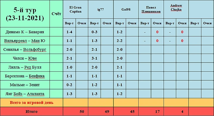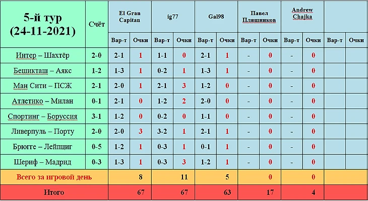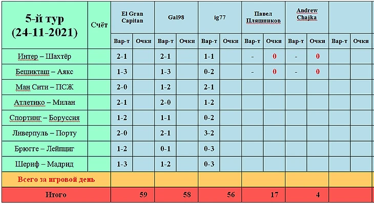 Как я и предполагал (несколько иначе, сознаюсь) - у нас появились два явных лидера и три явных аутсайдера, соответственно. Что ж, как говориться - назло рекордам, вперёд-к новым достижениям, олимпиада для всех и т.д и т.п. Ждём последнего тура группового этапа.