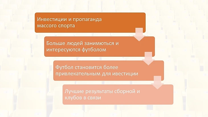 Но может быть сегодняшняя система делает футбол более массовым строятся академии повсеместно, идет пропаганда? Нет этого также нельзя сказать из-за того что клубы сосредоточенны на краткосрочных результатах на академии не выделяется нужного внимания. Более того из-за того что главный источник дохода клубов это дотации государства у них нет стимула растить своих игроков на продажу как в Сербии, Голландии например. Конечно стоит отметить что ситуация улучшается, но разве мы можем сказать что наша сегодняшняя молодежка претендует на победу в молодёжное ЧЕ. То есть в этом направлении очевидно не делается достаточно усилий
