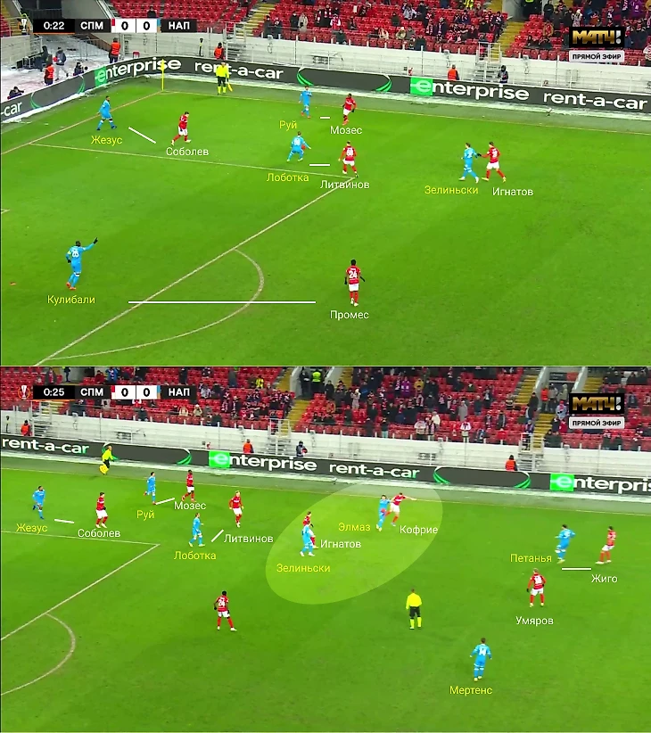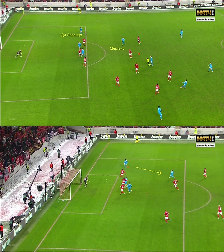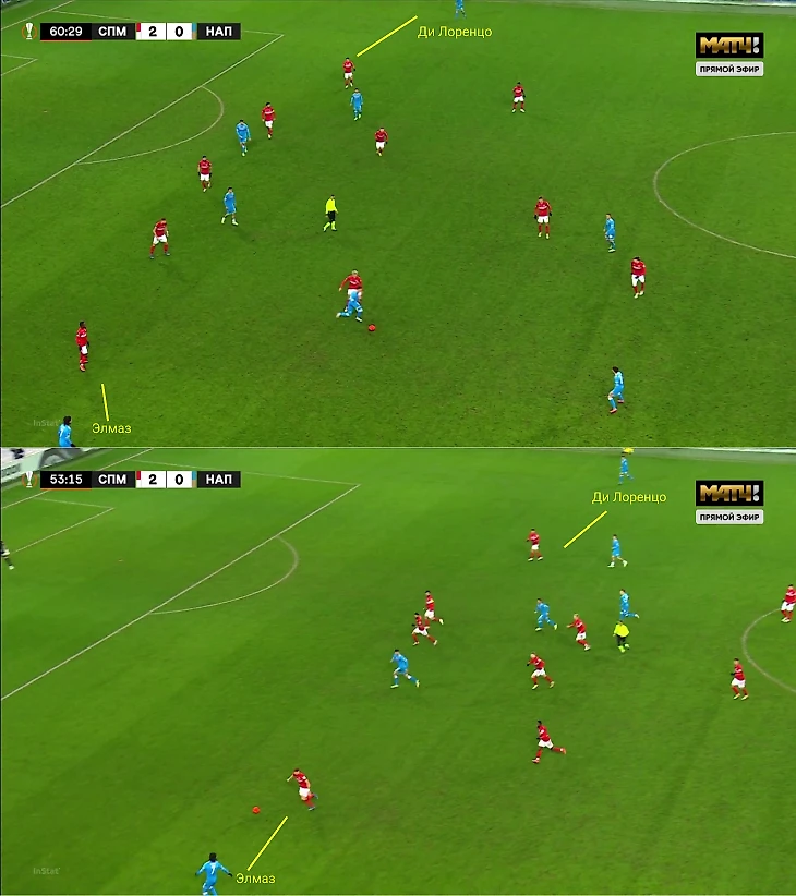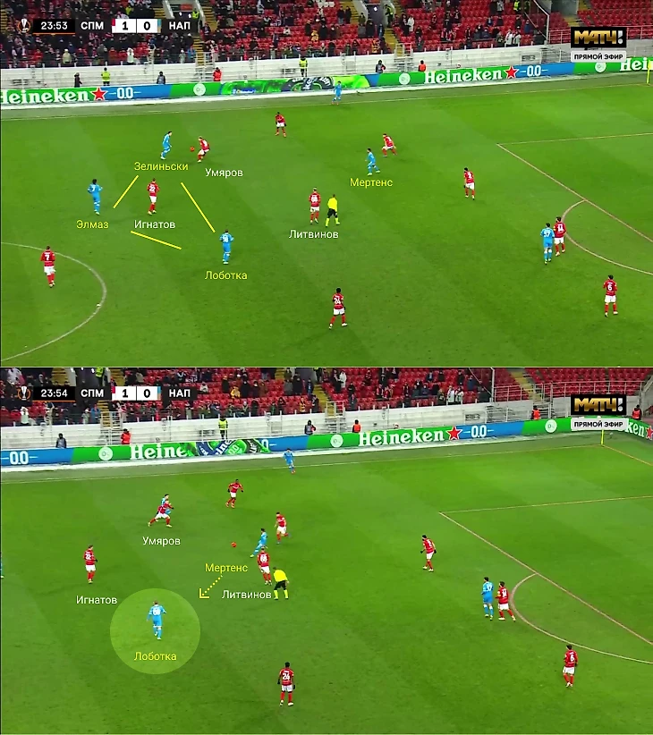 Еще один ход – смещения Элмаза в глубину. Он опускался к защитникам, менялся позициями с Лоботкой. Полузащитники разворачивали треугольник по-разному. Например, стягивали Умярова-Литвинова левее, чтобы Зелиньски или Мертенс оставались свободными справа.
