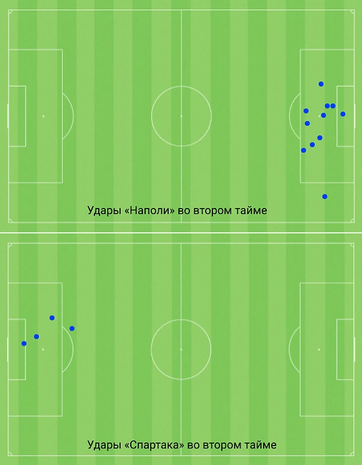 Второй тайм «Наполи» провел гораздо острее, чем «Спартак». «Наполи» сделал 14 передач в штрафную в первом тайме («Спартак» – 10), 30 – во втором («Спартак» – 7).