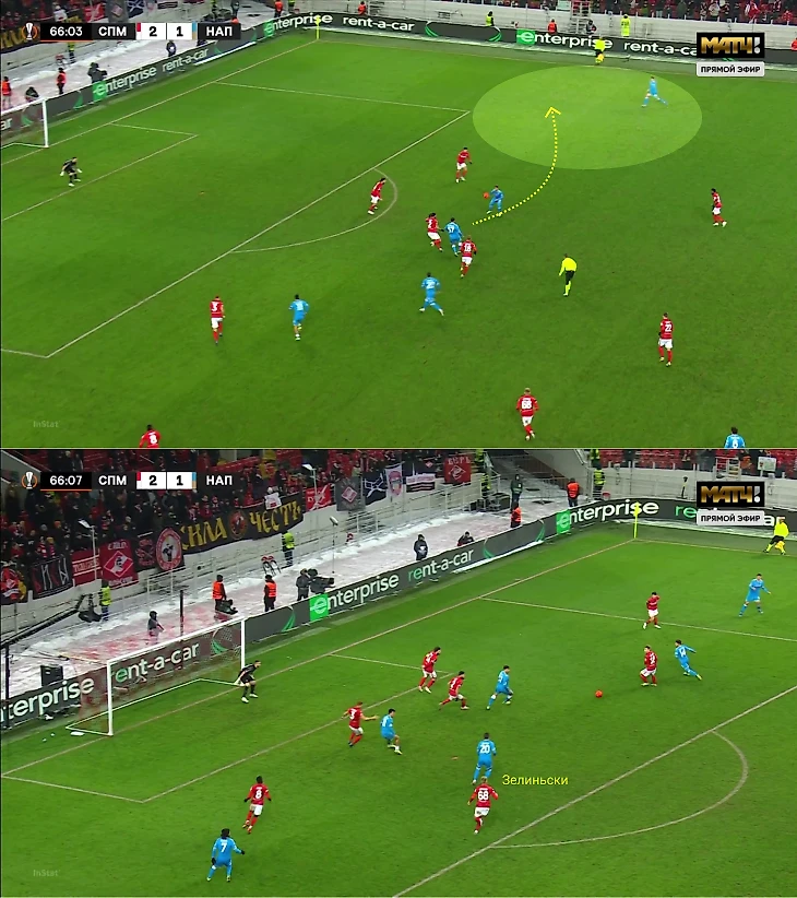 «Спартак» неплохо оборонялся в низком блоке и через прессинг, «Наполи» же разогнал несколько атак через смещения между линиями.