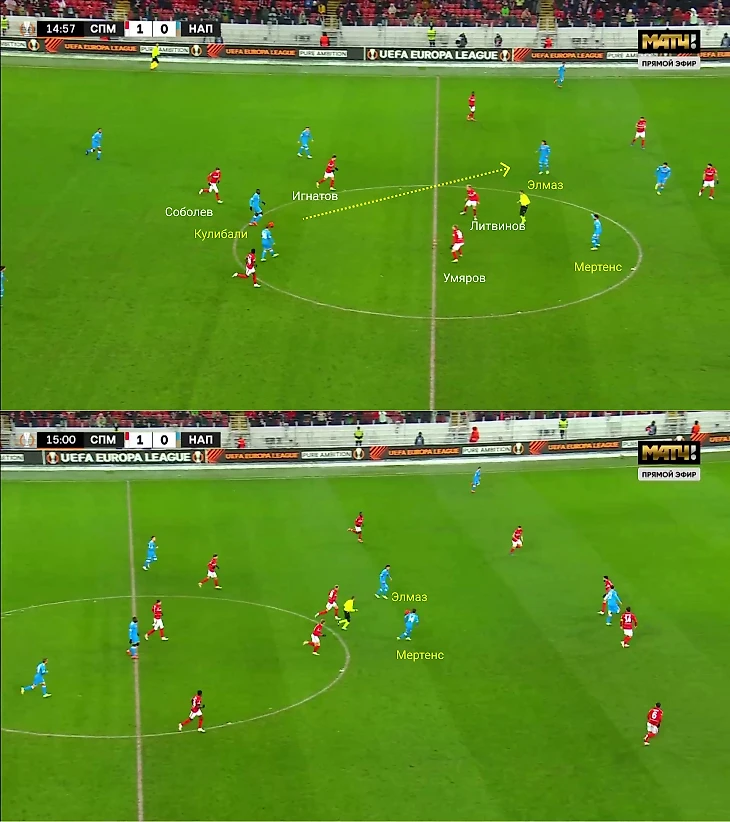 Главный шанс «Наполи» в первом тайме – двойной сэйв Селихова. «Спартак» не успел перестроиться после выноса Селихова, поэтому возникло пространство для рывка Кулибали. Умяров и Литвинов застряли в полупозиции. В итоге за их спинами оказались Элмаз и Мертенс, разогнавшие момент из середины поля.