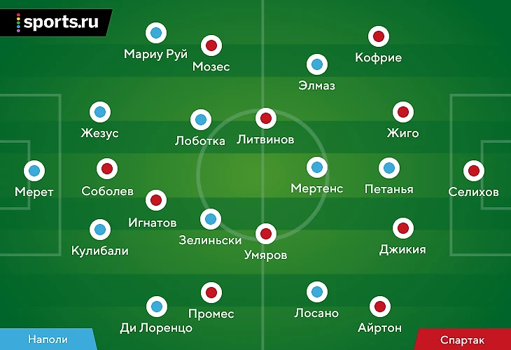 Первый тайм получился равным с точки зрения моментов. «Спартак» заработал пенальти, Мозес и Соболев организовали второй гол, плюс был момент с ударом Мозеса после великолепной работы Айртона на левом фланге. «Наполи» мог забивать после двойного удара Элмаза и выстрела Зелиньски в упор.