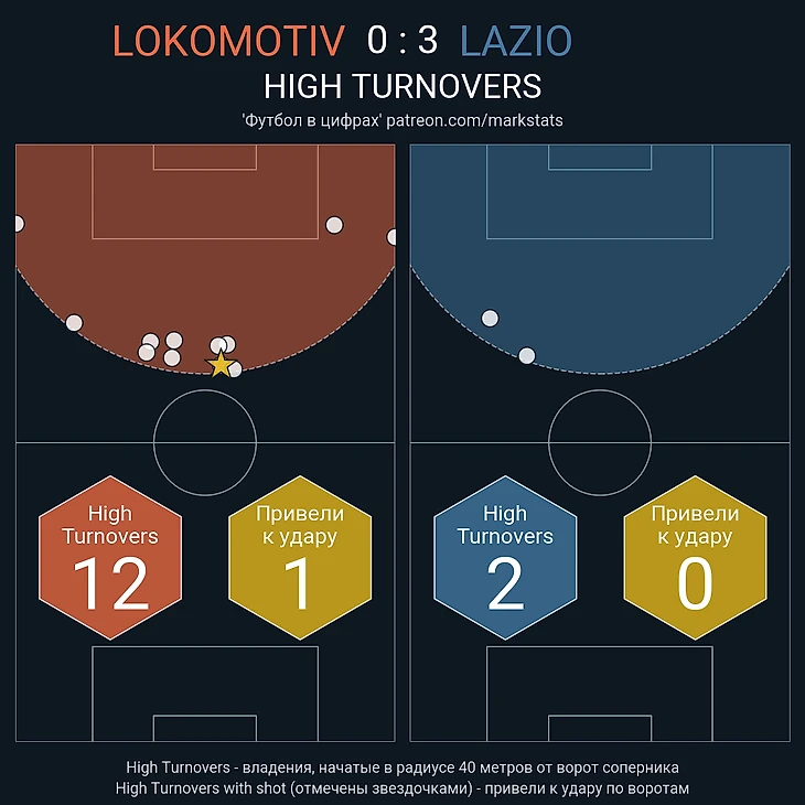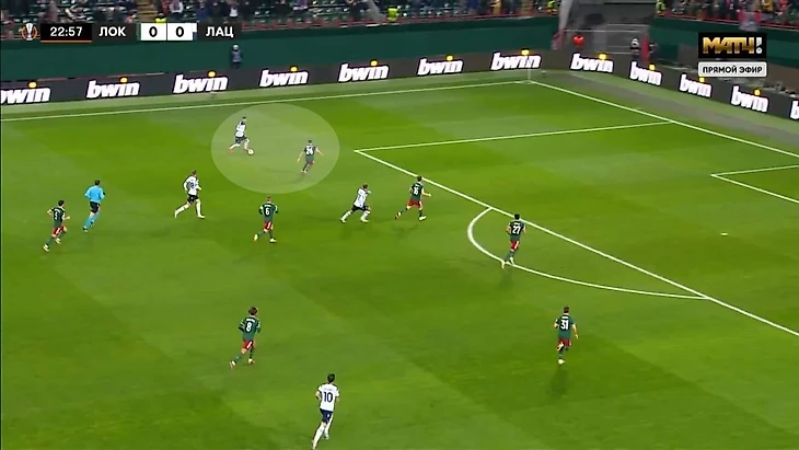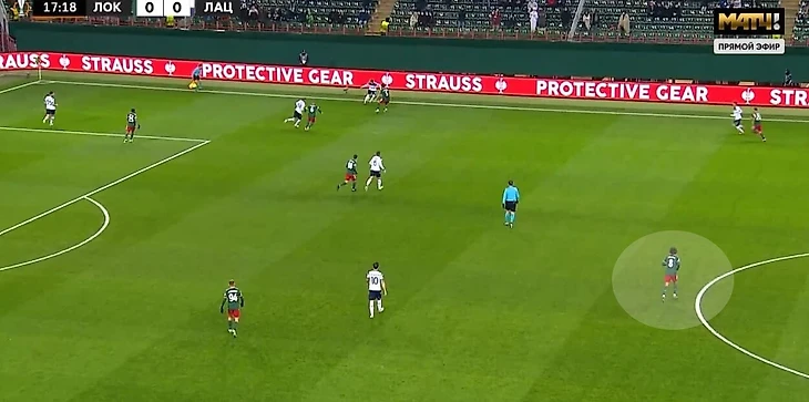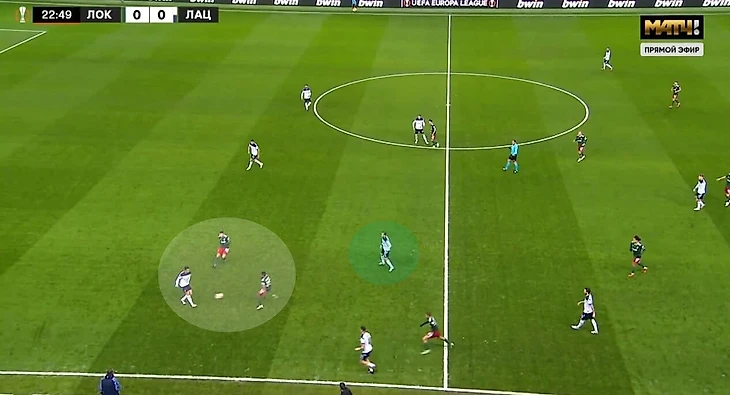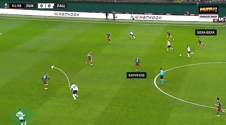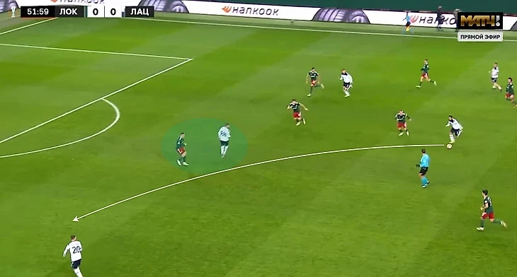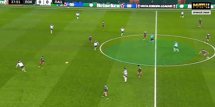 Это еще один серьезный элемент давления — однако он мог качнуться в любую сторону. Опять же, контрпрессинг помогал «Локомотиву» в некоторых эпизодах вернуть владение или замедлить атаку соперника, но были моменты, когда «Лацио» мог этим пользоваться. Например, на 23-й минуте Камано и Лисакович вдвоем пошли прессинговать Луиса Фелипе и были отрезаны одной передачей. «Лацио» смог довести мяч до Дзакканьи на левом углу штрафной в ситуации 1v1 против Ненахова.